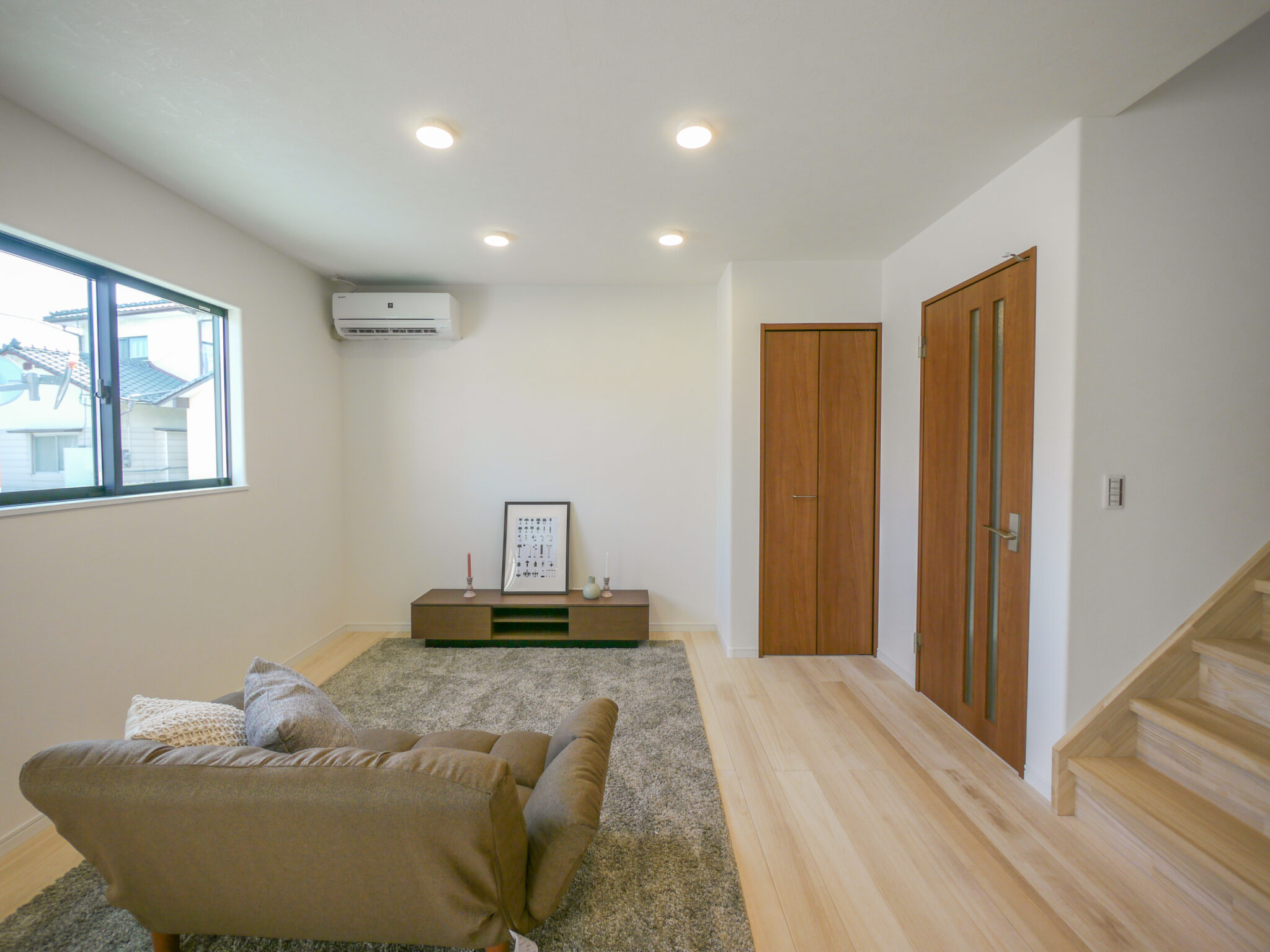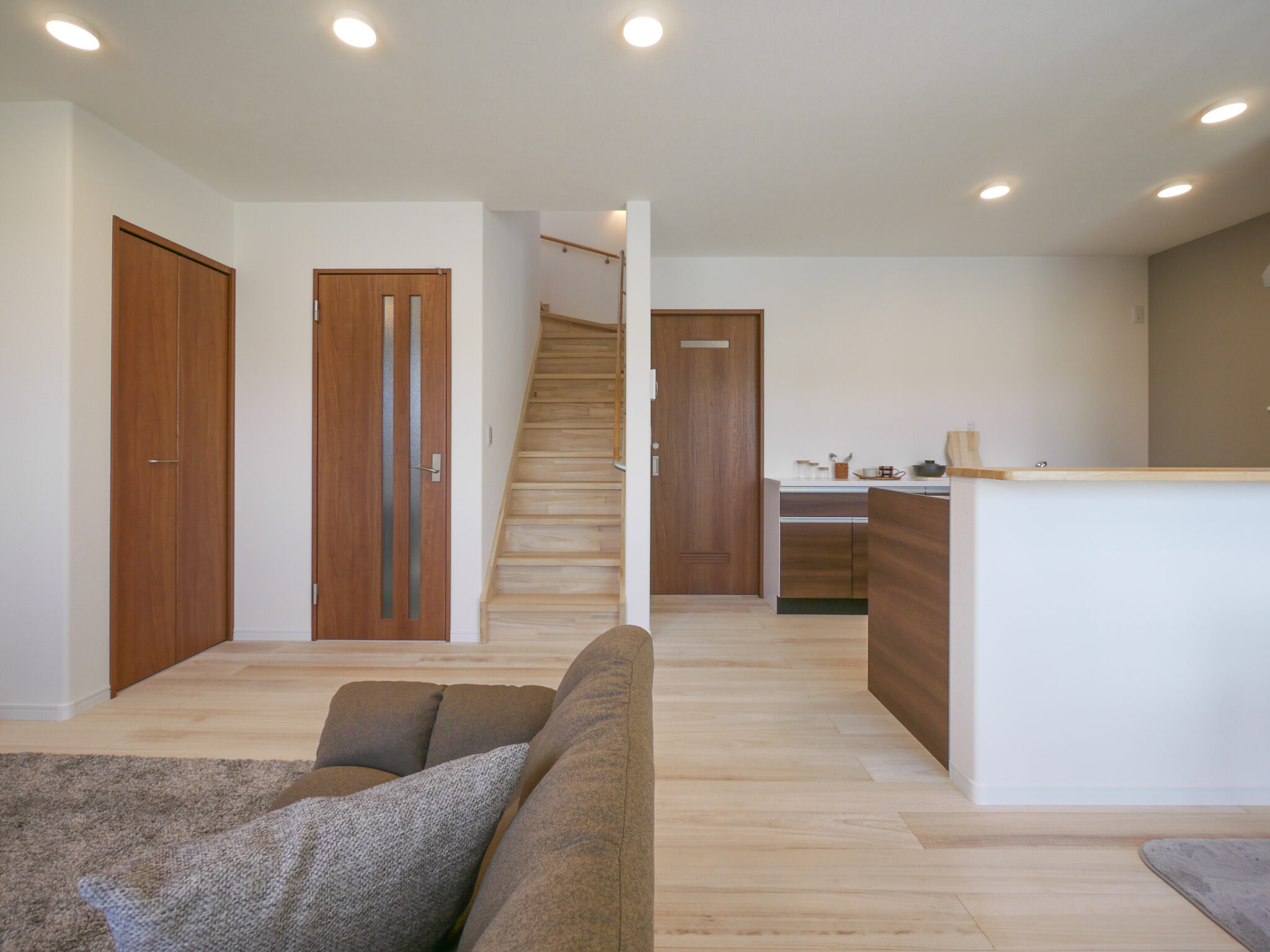無垢材の床に合わせ、ドア・キッチン・洗面所もすべて木目調のデザインで揃えたお洒落なお家です♪